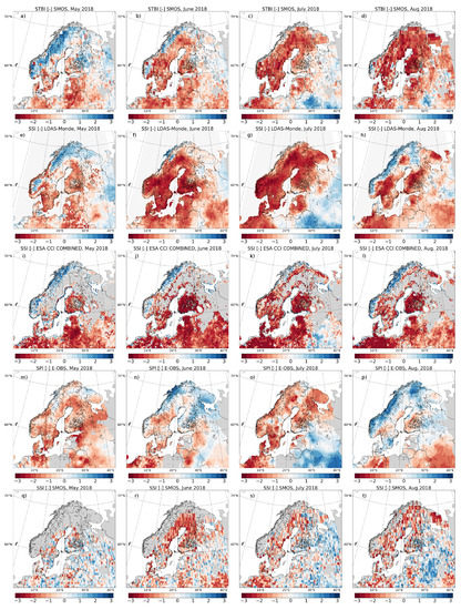 Figure 4a,e,i,m,q show the STBI_SMOS, SSI_LDAS, SSI_ESA_CCI, SPI-1 and SSI_SMOS for May 2018 over the Nordic region. The SPI-1 indicates a precipitation deficit for most of the domain. The STBI_SMOS, SSI_LDAS and SSI_ESA_CCI show that northern parts of Norway and the mountain regions in the south of Norway are wetter (colder for the STBI) than usual. This signal might come from late snowmelt wetting the soil in the northern latitudes and the mountainous regions in southern Norway. We also note that southern parts of Sweden and Finland are drier (warmer) than usual for the STBI_SMOS, SSI_LDAS and SSI_ESA_CCI. In general, the spatial patterns for May are very similar for the STBI and SSI_LDAS, although the STBI overestimates the wet regions in northern Norway and in Finland.