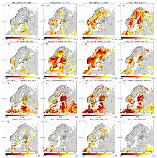 Following the D-scale [3], an SSI below is defined as a severe drought (D2 conditions). In Figure 5 we have plotted the STBI_SMOS (a–d), SSI_LDAS (e–h), SSI_ESA_CCI (i–l) and SPI-1 (m–p) for D2 conditions for May, June, July and August in 2018. We have not included the SSI_SMOS in Figure 5, because from Figure 4q–t we saw that the SMOS SM data were noisy and had large spatial gaps. The difference between the one month land surface indices (STBI_SMOS, SSI_LDAS and SSI_ESA_CCI) and the SPI-1 is most likely due to the lag time between the meteorological drought (one month SPI) and the agricultural drought (one month SSI). The SPI-1 has a shorter memory than the SSI, hence a dry SPI-1 in month i is often followed by a dry SSI in month , even though the precipitation is back to normal conditions in month . Using the SSI_LDAS as a reference we see that the STBI_SMOS is able to capture regions in severe drought where the SSI_ESA_CCI has masked values from the retrieval. This can be seen in southern Norway (July) and northern and central Sweden (July). Comparing Figure 5c,g,k we see that northern parts of Poland do not have severe drought conditions for the SSI_LDAS, and this is captured by the STBI_SMOS but not by the SSI_ESA_CCI. On the other hand, the spatial pattern of the SSI_ESA_CCI drought severity in June has better agreement with the SSI_LDAS than the comparison of the STBI_SMOS versus the SSI_LDAS. In August, the STBI_SMOS (Figure 2d)) is overestimating the regions experiencing severe drought conditions in northern Norway and Sweden, when compared to the SSI_LDAS (Figure 5h)).