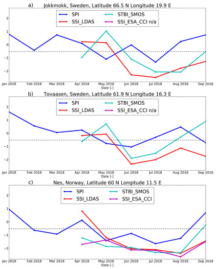 Accurate monitoring of drought onset and recovery could help farmers and decision makers minimize the negative impacts of a drought. Here we evaluate the temporal evolution of the STBI_SMOS index against the temporal evolution of the SSI_LDAS SSI_ESA_CCI and SPI-1 during the 2018 summer drought. As a consequence of the drought several regions in the Nordic countries experienced wildfires and agricultural losses [8,48], here we have chosen three sites to represent such conditions. In Figure 6 we have selected grid-cells in the vicinity of (a) Jokkmokk municipality, Sweden, (b) Tovaasen, Sweden and (c) Nes in Akershus municipality, Norway. These regions experienced large wildfires and agricultural droughts during the summer 2018 heatwave [6,7,8,48]. The horizontal dotted black line shows the D0 condition (moderate drought). The first thing to note is that in Figure 6a,b there are no data for the SSI_ESA because these grid locations are flagged in the retrieval algorithm. This limits the use of the SSI_ESA_CCI over regions in the Nordic countries for drought monitoring and mapping. Hence a reason for choosing grid-cells where we have no SSI_ESA_CCI data is to show that the STBI_SMOS can be used to monitor the drought in these regions.