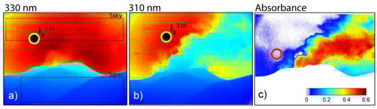 where A is the absorbance, I310 and I330 are pixel intensities associated with cameras mounting the 310 or 330 nm filter, while A0 is the absorbance level associated with a clear background sky sub-area of the image (assumed to be unaffected by SO2 absorption, I0310 and I0330 of Figure 2) and calculated as −log10(I310/I330), following Kern [55].
