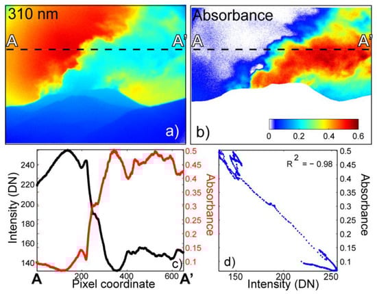 The image quality calculation method using the correlation coefficient between the 310 nm filter image (a) and the corresponding absorbance image (b). An intensity profile associated with a section (dashed line) crossing the volcanic plume, for both the 310-nm filter and absorbance images, is obtained (c). If these profiles are negatively correlated with a high correlation coefficient (d), then the gas is visible within the plume.
