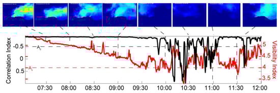 Example of output of the quality indexes sub-routine. The visibility (fog) and correlation indexes fluctuate through time as visibility conditions change (see snapshots on top of the figure). Gas is visible only when the fog index is greater than 4 and the correlation index is less than -0.5.
