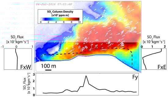 SO2 density flux calculated in the sub-area encompassing the summit craters. White arrows correspond to gas velocity vectors calculated on high coherence regions of the images. SO2 density flux distributions along the entire crater area and over the black dashed profile are calculated within the highlighted area, corresponding to vertical (Fy), western (FxW), and eastern (FxE) horizontal components, respectively. The SO2 total flux, for a given sector, was then calculated by integrating the density flux over the total length of the profile.