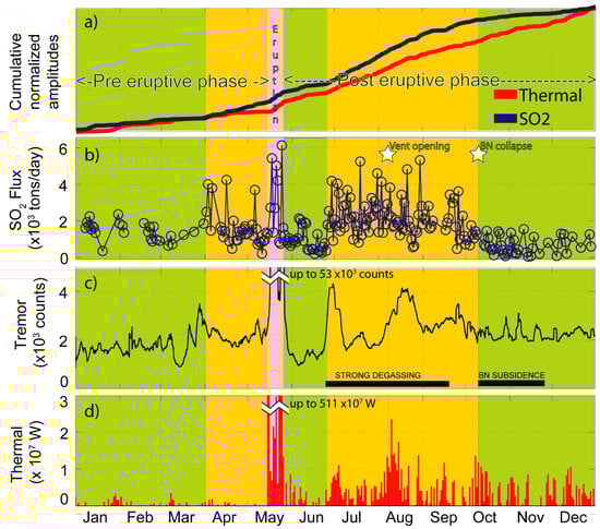 For this purpose, in Figure 10, we compared the cumulative SO2 flux trends (time-normalized) for three different periods encompassing three eruptive paroxysmal episodes, which occurred in August 2014, December 2015, and May 2016, respectively. For each of three events, we calculated the averaged SO2 fluxes (corresponding to the slopes of the cumulative curve) in the periods before, during, and after eruption, and we found significant similarities between the three events. In each of the three 2014–2016 events, the pre-eruptive fluxes fell in a relatively narrow range, between 1900 and 2500 t/d. The syn-eruptive (during the paroxysmal sequence) fluxes were typically higher, and spanned between 3000 and 5200 t/d (Figure 10), and were the highest during the December 2015 paroxysmal sequence that was consistently the most energetic in the past few years [67]. Lastly, each of the three post-paroxysmal phases was characterized by reduced SO2 emissions, ranging between 600 and 900 t/d, which impliesa reduced magma supply and degassing of a volatile depleted (residual) magma after each eruptive episode. These ranges were fully in agreement with those indicated by Reference [49] and by the analysis of a 13-year-long dataset.