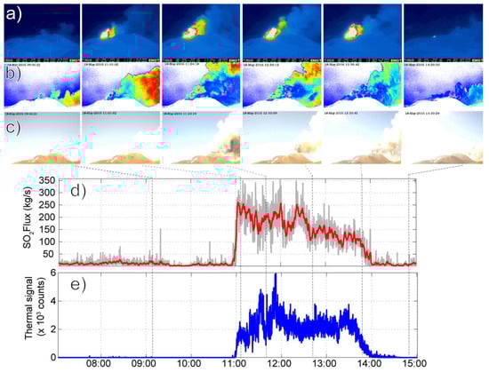 SO2 camera record during the 18 May lava fountain compared with the thermal signal recorded by the co-located INGV-OE TIR camera. The upper panels show thermal (a), absorbance (b), and visible (c) images of the summit area in specific time intervals. SO2 fluxes are shown in (d) as raw measurements (gray line) with the associated 10 second-window moving average (red line), while the thermal signal is shown in (e).