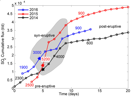 Comparison between cumulative SO2 flux trends associated with three lava fountaining paroxysmal sequences that occurred at NSEC (black line) in August 2014, and at VOR in December 2015 and May 2016 (red line and blue line). Stars indicate onsets of the paroxysmal sequence. Pre-eruptive, syn-eruptive, and post-eruptive phases show similar SO2 fluxes for all these three events. In each of these three events, pre-eruptive fluxes range between 1900 and 2500 t/d, syn-eruptive fluxes are the highest (3000–5200 t/d), while post-eruptive fluxes are systematically the lowest (<900 t/d).