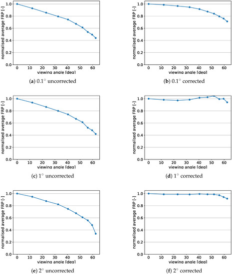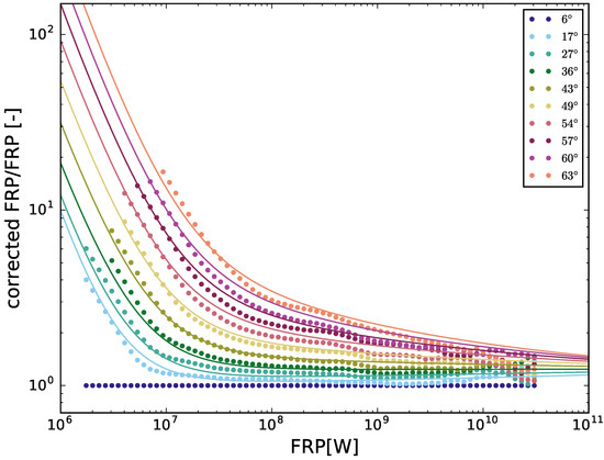 In the future, the presented bias correction technique can be applied to geostationary observations. There is even a potential to apply the correction functions directly with the parameters derived for MODIS to other satellites by translating the viewing angles to the corresponding pixel footprint sizes of the different satellite instruments and implementing a universal correction factor that depends only on pixel size and fire magnitude.