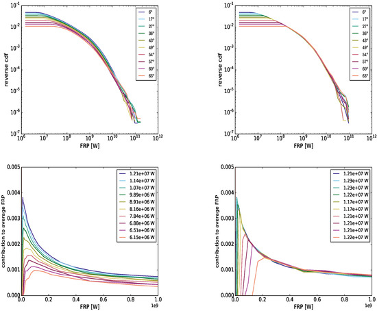 Figure 3 shows that for any given FRP bin, the number of observations decreases with increasing viewing angle with the exception of very large FRP values. At lower FRP values, the number of observations decreases rapidly with decreasing FRP magnitude. As mentioned before, the systematic shift is due to the increase in the detection threshold. The underestimation in the gridded-FRP is also evident from the offset between the frequency-distributions for different viewing angles. The amount of total FRP which corresponds to the missing detections can be estimated from the average gridded-FRP (see Figure 3).