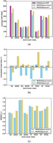 Statistics between co-located MODIS/Aqua and VIIRS/Suomi-NPP gridded-FRP observations (hourly, 2017) with and without correction, and classified according to the land cover type. (a) The average gridded-FRP of MODIS and VIIRS co-located pairs; (b) the normalized mean bias between MODIS and VIIRS co-locations. The number of co-locations for each landcover class are mentioned near the zero-bias line; (c) the normalized root mean square error (NRMSE) between the co-located pairs. The co-location pairs with MODIS viewing angle greater than are excluded in these statistics. The labels “corr” and “uncorr” refer to MODIS/Aqua gridded-FRP observations with and without bias correction. The land cover classes used to aggregate the VIIRS/Suomi-NPP and MODIS/Aqua FRP co-location pairs, for comparison according to the fire type: savanna (SA), savanna with organic soil (SAOS), agriculture (AG), agriculture with organic soil (AGOS), tropical forest (TF), peat (PEAT), extra-tropical forest (EF), and extra-tropical forest with organic soil (EFOS) [2].