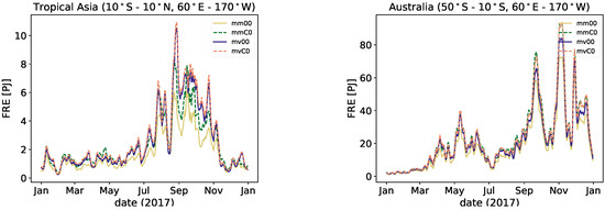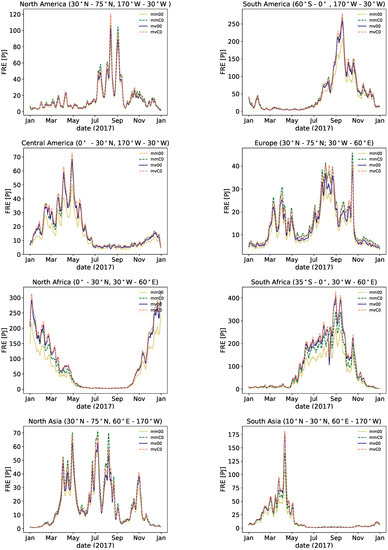 The energy release over all continental regions is dominated by the seasonal biomass burning in each region. Among all experiments, the FRE values are lowest in MOD- & MYD-uncorrected (‘mm00’). The difference is highest during the peak burning season, while the magnitude of energy release in other three experiments (‘mv00’, ‘mmC0’, ‘mvC0’) varies according to the regions. The energy release from boreal fires in North America and North Asia is smaller when VIIRS gridded-FRP observations are assimilated. There may be an underestimation of VIIRS gridded-FRP observations over boreal forests due to infrared signal attenuation in the atmosphere, which has already been described in the previous section. Among other land-cover types, regional differences in the energy release are observed over tropics. A larger number of detections by VIIRS over tropical regions [23,28] is a dominant factor towards the higher FRE in GFAS experiments with VIIRS FRP input.