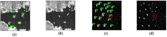 The image before and after refined lee filtering is shown in Figure 3. From Figure 3, on the one hand, some speckles are restrained, and on the other hand, the basic features of ships are well preserved. Although image preprocessing can reduce the negative impact of noise, it may also degrade the performance of small ship detection. For example, as is shown in Figure 3d, the refined lee filter may smooth out some small ships from the original image. The effect of the size of the filter window on the detection performance will be discussed in Section 3.4.