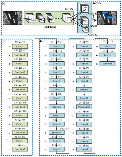 G-CNN is mainly composed of B-CNN and D-CNN as shown in Figure 4. First, the SAR image to be detected was resized to 416 × 416. Then the features of the ship were extracted by B-CNN in 1024 feature maps with a scale of 52 × 52. Finally, the output of B-CNN was connected to D-CNN to complete ship detection. B-CNN is the backbone of G-CNN, which is used to extract ship features. There are some network structures that can be used as the backbone of a target detector, such as visual geometry group-16 (VGG-16) [], GoogLeNet [], and so on. However, these network structures have more parameters and consume more computer memory, which will increase detection time. Therefore, we use a lightweight network MobileNet [] to extract features. MobileNet is an efficient model for mobile and embedded devices. Based on streamlined architecture, MobileNet uses depthwise separable convolution (dw) to construct lightweight deep neural networks, which can greatly reduce the amounts of parameters and calculations.