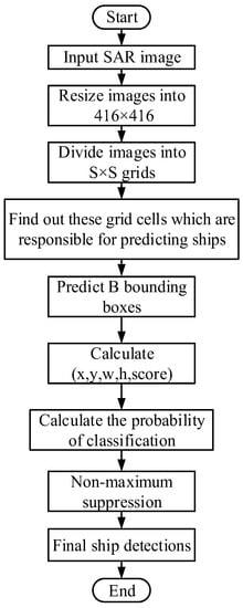 Therefore, in order to improve the detection speed of the second stage, this paper presents a high-speed ship detection method in SAR images based on a grid convolutional neural network (G-CNN). The inspiration for this method originates from you only look once (YOLO) [,,]. G-CNN is mainly composed of a backbone convolutional neural network (B-CNN) and a detection convolutional neural network (D-CNN). First, SAR images are divided into grid cells and each grid cell is responsible for the detection of specific ships. Then, the whole image is input into B-CNN to extract features. Finally, ship detection is completed in D-CNN under three scales. This model based on mesh partition assigns ship detection tasks to each grid cell, which increases the detection speed. We experimented on an open SAR Ship Detection Dataset (SSDD) [,,] to establish the ship detection model. In addition, in order to verify the applicability of G-CNN, we also detected ships in two SAR images from RadarSat-1 and Gaofen-3. The experimental results show that the detection speed of our proposed method is faster than most of the existing methods, such as the faster-regions convolutional neural network (Faster R-CNN), single shot multi-box detector (SSD) [], and YOLO, under the same hardware environment with NVIDIA GTX1080 graphics processing unit (GPU), meanwhile the detection speed is almost maintained within an acceptable range. This method based on G-CNN has great application values in real-time maritime disaster rescue and emergency military strategy formulation.