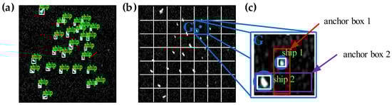 The concept of the anchor box was first proposed in Faster R-CNN by Ren [], which is widely used in other excellent target recognition models afterward, such as YOLO and SSD. An anchor box is proposed to solve the shortcoming that a grid cell detects only one ship.