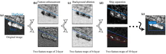 In the field of deep learning, features of the ship are extracted automatically by CNN without manual involvement. There are fewer reports visualizing the feature maps [,,,,,,,,,,] because the detection system based on deep learning is a black-box model. In other words, the feature extracted by the convolution neural network is abstract and difficult to explain []. Therefore, in order to fill the vacancy, we tried to visualize the trained model to explain the process of feature extraction in our proposed G-CNN. From Figure 4b in Section 2.2, the outputs of 2-layer were 208 × 208 × 64 feature maps, where 208 × 208 was the size of the feature map and 64 was the number of feature maps. Additionally, the feature maps were 104 × 104 × 128 for 6-layer and 52 × 52 × 256 for 10-layer. We choose two feature maps from each layer for visualization, respectively, shown in Figure 11b–d.