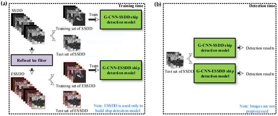 Therefore, we also studied the effect of a pre-processing refined lee filter on high-noise samples and small ship samples as is shown in Figure 18. From Figure 18, the detection performance of G-CNN with a refined lee filter for high-noise samples was superior to that of G-CNN without a refined lee filter. In the second high-noise image, a ship with distinct features was missed meanwhile a false alarm appeared. The false alarm rate of G-CNN with a refined lee filter was less than that of G-CNN without a refined lee filter for those small ship images. Finally, we still chose G-CNN with a refined lee filter as the ship detection model to improve accuracy (from 87.48% to 90.16% shown in Table 3) because the number of high-noise images (19.91% of 1160) is more than that of small ship images (2.8% of 1160). We also tried to adjust the size of the filter window, but the improvement of detection performance was not obvious for the whole dataset. In fact, small target detection has become an important branch of deep learning object detection, which is being studied by many other scholars. Given that the primary task of this paper was to improve the detection speed, we have not carried out a detailed study of small target detection.