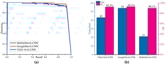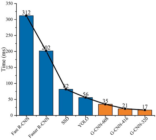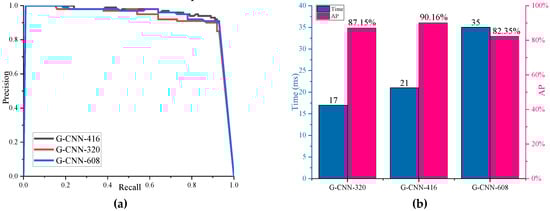 Finally, we also studied the influence of different input scale images on the test results. We resized SAR images to be detected to three input sizes 320 × 320, 416 × 416, and 608 × 608. We named these G-CNNs as G-CNN-320, G-CNN-416, and G-CNN-608, separately. The AP and detection time of ship detection are shown in Figure 16. From Figure 16, we can find that the smaller the size of the image input into the network is, the less the detection time will be. G-CNN-416 has the highest detection accuracy, which may be related to the original size of the image in the dataset. Therefore, we chose G-CNN-416 as the final ship detection model.