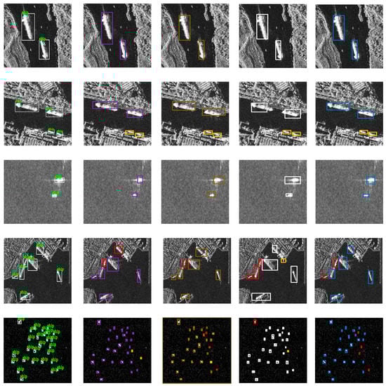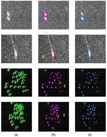 As is shown in Figure 7e, in the field of deep learning, generally, after the target is detected, the detection system also needs to classify the target such as bird, cat, dog, and so on in the PASCAL VOC dataset []. Because we only need to detect one type of target in the SSDD, the target is recognized as a ship directly once detected. In short, conditional probability Pr(ship|target) = Pr(ship).