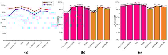 The impact of models built from the SSDD and ESSDD on AP by different methods. (a) AP of the SSDD and ESSDD; (b) AP of the SSDD; (c) AP of the ESSDD.