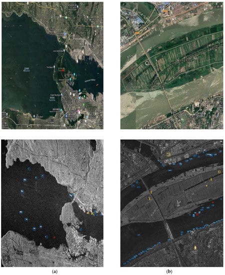 The first important factor of ship detection based on deep learning methods is to build a huge and representative dataset. Therefore, in order to fully consider the various conditions of ships in the ocean, we used the open SSDD [] for experiments which has been used by many other scholars. Additionally, real ships have been correctly labeled by Li et al. [,,].