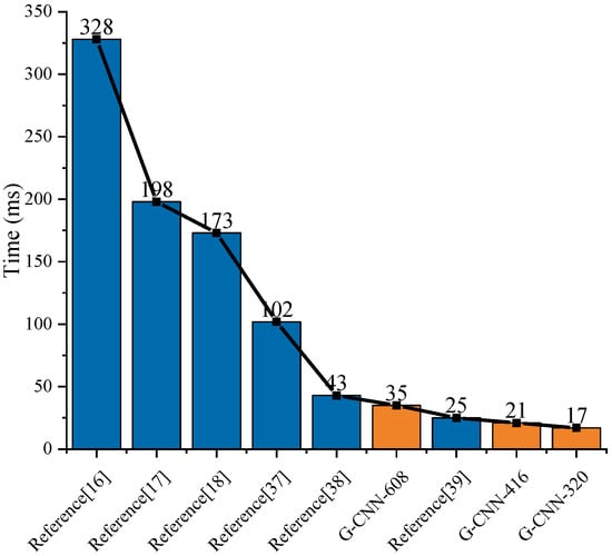 Finally, we compared the references with a similar hardware environment with NVIDIA GTX1080 graphics card and the contrasting results of detection time are shown in Figure 23. From Figure 23, the detection speed of our G-CNN ship detection system was faster than the methods in most references. When we chose G-CNN-416, the detection speed was the fastest. In particular, the detection time of traditional feature extraction methods reached the second level, so we ignored their comparison. Moreover, it should be noted that reference [] only takes 11 ms to complete the detection of an image. However, the graphics card they use is NVIDIA TITAN X, whose performance is better than NVIDIA GTX1080 we used, so it was not convenient to make a reasonable comparison.