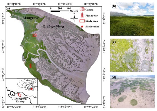 The overview map (a) of the intertidal wetland in Zhangjiang estuary, Fujian, China, from RGB orthophoto (April 14th, 2017) and typical wetland landscapes of mangrove forests (b), mangrove-Spartina alterniflora ecotone (c), and isolated S. alterniflora patches (d). The locations of ground camera and flux tower are also shown.