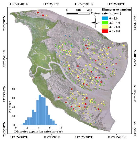 During the period of explosive expansion of S. alterniflora from 2014 to 2017, both the number and mean expansion rate of isolated patches decreased with time (Table 1), likely due to space limitation. For example, during 2014–2017, the number of isolated patches (>0.5 m in diameter) declined from 902 to 325 due largely to coalescence. The 325 remaining patches were comprised of 196 isolated patches persistent for 2014–2017, 41 newly formed in 2015, and 88 newly formed in 2016. Patches isolated for at least three consecutive years from 2014 to 2017 were mostly situated at lower elevations at the seaward fringe where there was a larger open mudflat area for S. alterniflora growth. They were least likely to occur at higher elevations landward, close to mangrove forests, where space for growth was more limited (Figure 2). Annual expansion rates of isolated S. alterniflora patches over the wetland followed a normal distribution with mean diameter growth of 4.28 m/year. The majority of patches had a diameter growth of 2~6 m/year.