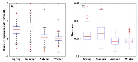 Seasonal dynamics of diameter expansion rate (a) and greenness (b) of isolated Spartina alterniflora patches over one-year period from March 2017 to February 2018. The statistical metrics including median (central mark of the box) and upper/lower quartiles (edges of the box) were calculated from all isolated patches within the year (N = 252) over the intertidal wetland in the Zhangjiang estuary, Fujian, China.