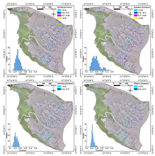 Spatial distributions of patch-mean greenness of isolated Spartina alterniflora patches (N = 252) with corresponding histograms shown in insets for four seasons: (a) spring (March~May, 2017), (b) summer (June~July, 2017), (c) autumn (October~November, 2017), and (d) winter (December 2017~February 2018).