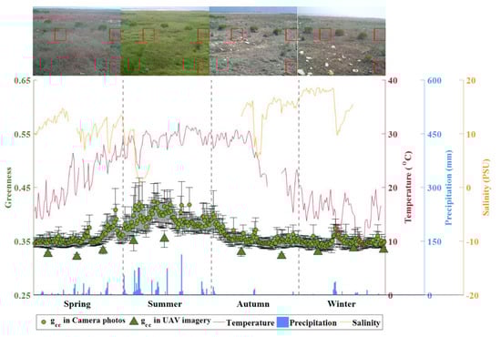 Temporal variation in daily camera-based greenness of Spartina alterniflora and in-situ environmental variables (air temperature, precipitation, and salinity) from March 2017 to February 2018. A ground camera installed at a fixed position (see Figure 1) was used to record daily images of a particular region of contiguous Spartina alterniflora with typical images shown for each season, and camera-based greenness of Spartina alterniflora was calculated from image subsets indicated by red boxes. Monthly greenness from UAV imagery is also shown for comparison. Salinity was not recorded from mid-summer to early autumn due to instrument failure.