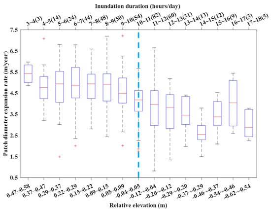 Our results confirm that inundation duration (or relative elevation) plays an important role in governing the expansion rate of isolated S. alterniflora patches. Following the fundamental ecophysiological principle “law of tolerance” [], intertidal plants tend to show a hump-shaped growth pattern along the inundation/elevation gradients [,]. This hump-shaped growth pattern had been confirmed for S. alterniflora in this wetland via a “marsh-organ” experiment with elevation treatments spanning from −0.5 m to 2.0 m (corresponding to 14.4~0 h/day for inundation duration) [], showing S. alterniflora reaches optimal growing condition at an inundation duration of ~7 h/day (equivalently at an elevation of 0.5 m). In this study, isolated patches over this wetland had the highest elevation only up to 0.6 m; therefore, we did not have an enough elevation range to further confirm this hump-shaped growth pattern at the landscape scale. However, we were able to conduct an overall comparison of the growth over a range between −0.5 m and 0.5 m in the field (this study) and a “marsh-organ” experiment []. In fact, the declining spatial pattern between expansion rate and inundation duration in this study (Figure 6) corresponds well to one half of the hump-shaped growing curve showing declining biomass with increasing inundation [], and the optimal inundation duration for S. alterniflora over this wetland, 4~9 h/day, is comparable to Peng et al. [] and other previous studies exploring the elevation-growth relationship for tidal marshes (e.g., Adam et al. [] and Voss et al. []). The subsequent steep decline of expansion rate with increasing inundation (>9 h/day) suggests that anaerobic habitats with intensive tidal inundation suppress growth potential of S. alterniflora []. Although salinity could be another factor influencing spatial growth pattern of S. alterniflora [], the role of salinity here was negligible, given that the range of measured sediment pore-water salinity was small (4 PSU) and the inundation time was across the high end of the spectrum.