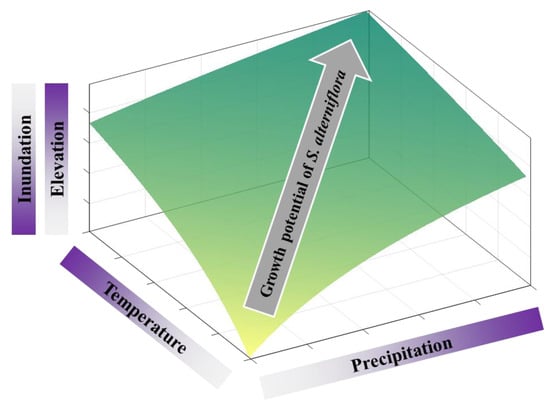 Schematic diagram of the influences of tidal and meteorological regimes on the growth potential of Spartina alterniflora over the intertidal wetland in the Zhangjiang estuary, Fujian, China. Darker colors denote higher magnitude of different factors as shown in axes of the three-dimensional (3-D) plot. The growth potential of S. alterniflora is co-regulated by tidal (z-axis) and meteorological (x- and y-axis) regimes, in which spatial heterogeneity is controlled by inundation or elevation, while temporal variation is subject to temperature-precipitation dual controls. Note that the range of elevation here is limited to vegetated intertidal zone with S. alterniflora (lower than the optimal elevation of the parabolic expansion-elevation relationship).