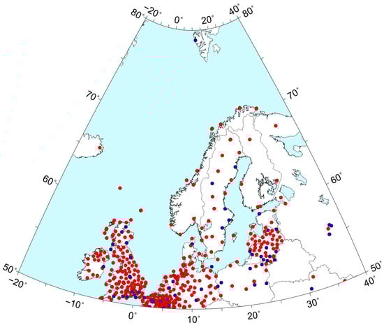 We employ the newest GPS position time series recorded at 469 European permanent stations processed by the Nevada Geodetic Laboratory (NGL) in a center-of-mass (CM) frame in precise point positioning (PPP, [44]) mode [45]. The GPS observations were processed in the GIPSY/OASIS-II software developed by the Jet Propulsion Laboratory (JPL). The exact details and models used during the processing can be found at http://geodesy.unr.edu/gps/ngl.acn.txt. We choose stations with latitudes greater than 50°N with position changes in the Up direction (Figure 1). This latitude is taken arbitrarily, since at lower latitudes, the PGR effect is covered by other, tectonic-related movements [46,47]. A full list of the names and coordinates of the GPS stations are provided in Supplementary Materials Table S1.