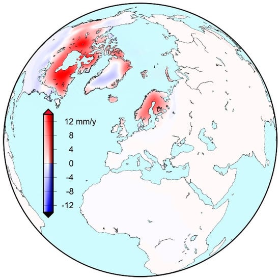 - Simon, K.M.; Riva, R.E.M.; Kleinherenbrink, M.; Frederikse, T. The glacial isostatic adjustment signal at present day in northern Europe and the British Isles estimated from geodetic observations and geophysical models. Solid Earth 2018, 9, 777–795. [Google Scholar] [CrossRef]