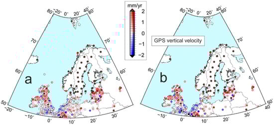 (a) The GPS-derived vertical rates, estimated for all European GPS stations employed in this research: 469 stations are presented. (b) The statistically significant GPS-derived vertical rates: 297 stations are presented.