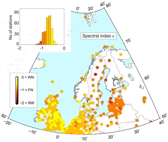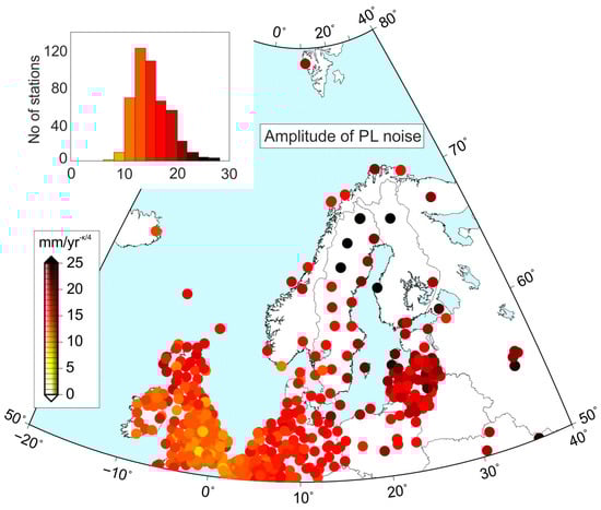 Similarly to the spectral indices, the amplitudes of the power-law noise are also spatially dependent, with extreme values equal to 28.0 and 7.7 mm/yr−κ/4 for, respectively, VIL6 and RAL1 (Chilton, UK) permanent stations (Figure 6). The time series from stations located in the Baltic countries are characterized by the greatest amplitudes, exceeding 15 mm/yr−κ/4 with the maximum values found for Sweden, Finland and Latvia. The smallest values are found, again, for the North Sea coast, especially for the southern part of the UK, the Netherlands and Belgium. Germany is the area with average values of power-law noise amplitudes, dividing Europe into two halves with large (East) and small (West) amplitudes of noise. Also, the UK area is divided; the northern part is characterized by amplitudes closer to 20 mm/yr−κ/4, and larger than the estimates derived for the southern part.