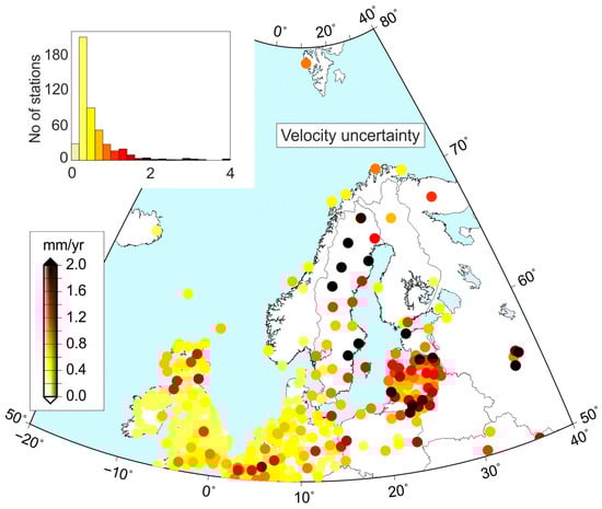 The significance of the vertical rates we derive from the GPS position time series processed by the NGL laboratory is examined. Figure 4 presents the vertical velocities estimated with the MLE algorithm for the entire European area, and only those which are recognized here as statistically significant, meaning that the value of velocity is higher than its uncertainty: its standard error computed with Equation (4), Figure 7. All of the Scandinavian, Danish and Estonian vertical rates are found here as significant (see Supplementary Materials Table S1) and are left for further analyses. Due to their small vertical rates, 172 velocities from central and western Europe are found to fall below their uncertainties. These stations are therefore excluded from further analyses. The uncertainties of vertical velocities range here between 0.1 and 3.9 mm/yr. The largest uncertainties are found for sites affected by the lowest spectral indices and the greatest amplitudes of power-law noise; i.e., for the Baltic Sea area. These two parameters, when combined together in Equation (4), result in a high velocity variance. Naturally enough, the stations situated within the North Sea area—i.e., the UK, Belgium, the Netherlands and Denmark—are all characterized by small velocity uncertainties, which resulted in the fact that a large number of the vertical rates are recognized as significant (Figure 4a). Few of the English and Belgian sites are found to have large velocity uncertainties, although both the spectral index and the amplitude of power-law noise are small enough to result in a low velocity uncertainty. These sites may have been affected by local phenomena which occurred as unmodelled events in the stochastic part and therefore leads to overestimation of the velocity uncertainties. All other western European vertical rates are characterized by uncertainties lower than 0.6 mm/yr, as computed with the power-law and white noise combination. The Swedish stations, despite having large velocity uncertainties, are still recognized as statistically significant since the values of vertical rates are large enough.
