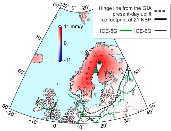 To compare the GPS-derived uplift with the expected present-day motion arising from the PGR, we employ the newest version of the GIA predictions, i.e., ICE-6G_C (VM5a) [43], referred to as ICE-6G herein (Figure 2). We make use of 1° per 1° global grid estimates at the time 0.0 Ka (kiloannus, 103 years). This model was refined in comparison to the previous versions, i.e., ICE-5G (VM2) [49], by adding the GPS measurements of the vertical motion as an additional input, and by specifying the exact reference frame of these observations. Also, additional constraints have been applied to optimally fit, but only the Antarctic component to the GPS observations [50]. The present-day uplift predicted from the ICE-6G GIA model is also employed to construct the hinge line.