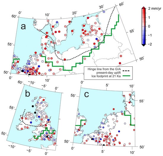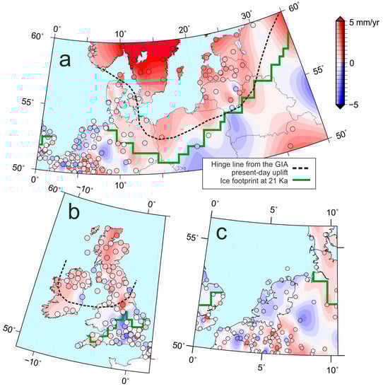 The differences between the GPS-derived vertical rates and the uplift predicted by the ICE-6G GIA model at the GPS station coordinates. The hinge line, constructed based on the present-day GIA uplift, and the ice footprint at the time 21 Ka are plotted with the dashed and green lines, respectively. Individual maps show eastern Europe (a), the British Isles (b) and western Europe (c).