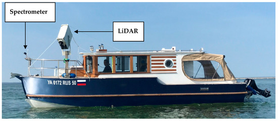 The spectrometer with field-of-view (FOV) of 20° was installed on the bow railing in the center of the motorboat at the zenith angle of 30°. These conditions were chosen based on the proximity to the requirements of the NASA protocols [38] and practical feasibility. Its azimuth angles were mechanically changed to keep the angle of 90° to the Sun when motorboat changed its track. It was necessary to ensure the constancy of the observation geometry and illumination. The second optical instrument LiDAR with FOV of 1° was also installed on the bow, slightly behind the spectrometer. It was oriented at an angle of 30° to the zenith and at 45° to the motion direction. Such a position of both optical devices was necessary to perform passive optical observations and active laser sensing of the unperturbed water surface in front of motorboat and minimized the falling of splashes and sun glints to the FOV. The motorboat position was registered by onboard Chartplotter Garmin EchoMap 721.