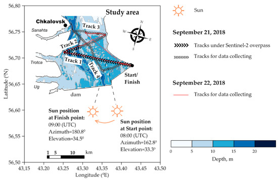 In situ measurements were carried out from the south side of the reservoir (Figure 4) under Sentinel-2B and MODIS Aqua/Terra overpass on 21 and 22 September 2018, respectively (the results of MODIS images processing are not included in this study). They were performed from 8:00–9:00 UTC. The sky was clear, the weather was sunny. During this time, the Sun azimuth angles and solar elevations varied within 162.8°–180.8° and 33.3°–34.5°, respectively (Figure 4). Wind waves were smooth (height was about 0.3–0.5 m) according to WMO Sea State Code on the first day and calm on the second one. The motorboat route began at the start point, passed along four tracks and ended at the Finish point, which coincides with the start point (Figure 4). Each track was about 6–8 km and took about 10–15 min, meanwhile, the Sun position changed by azimuth and elevation for 4.5° and 0.3°, respectively. Therefore, we considered that lighting conditions change slightly. However, to control this assumption, the downwelling irradiance was measured by the spectrometer at the Start and Finish points for each track. Simultaneous measurements of the upwelling radiance and fluorescence signals were performed by the spectrometer and LiDAR, respectively, along each track (details are shown below).
