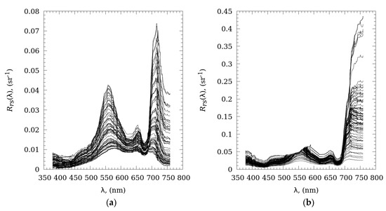 Examples of Rrs spectra measured in the Gorky reservoir for two days: (a) spectra included in the temporal-synchronous dataset for calibration/validation of empirical models; and (b) spectra excluded from calibration/validation dataset.