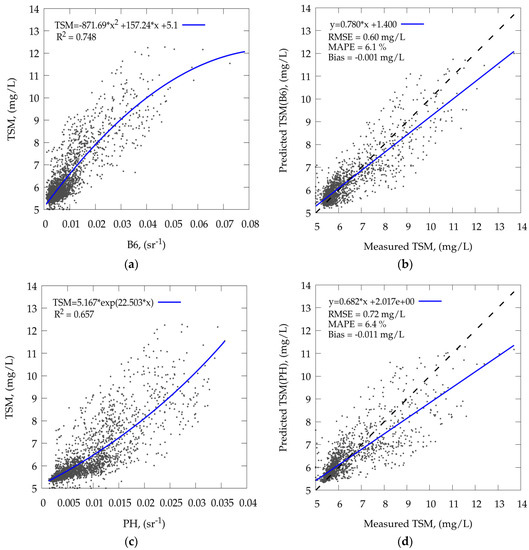 Furthermore, it should be noted that the calibration coefficients for all models were significantly lower in comparison with [24,25,61,62], possibly due to features of the hydro-optical water properties of the Gorky Reservoir. However, the calibration coefficients of the linear PH model (y = 2231x + 12.7; R2 = 0.80) obtained in [19] were quite close to those obtained in our research.