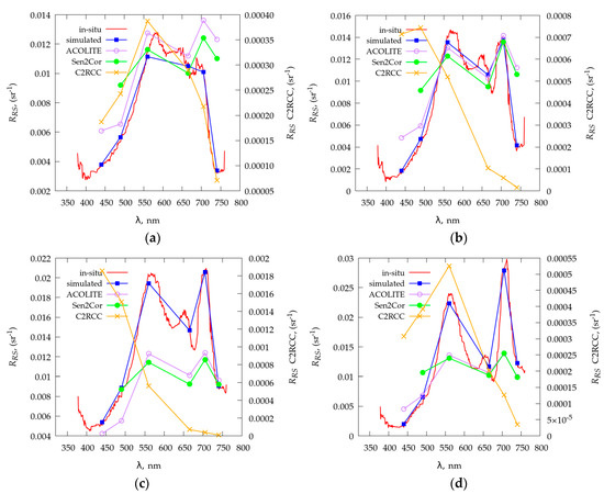 Considered Sentinel-2 image processing tools were not allowed to retrieve remote sensing reflectance with the accuracy required for water applications. Only ACOLITE and Sen2Cor could reproduce the spectrum features at B3–B5 bands (R2 = 0.56–0.87), but significantly underestimated remote sensing reflectance: average and maximum values are less by 12–23% and 100–125%, respectively (Table 6). The performance of blue bands (B1, B2) and the NIR band (B5) was considerably worse. It was noted in [68] that high performance of ACOLITE-retrieved reflectances in green (B3) and red (B4) channels mainly related to the higher reflectance range than in the blue and NIR bands. Large overestimation in NIR bands could be caused by the calibration performance at low radiances, adjacency effects, or surface effects. This explains the difference in the accuracy of the MSI bands that were also noted in [5,15], but does not explain the large difference from the in situ measurements.