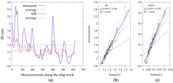 where is the spectral response function of Sentinel-2B/MSI; are in situ hyperspectral radiometric data; and and are the lower and upper wavelengths of the MSI spectral band. Further, they were overlapped on the satellite image and averaged pixel-by-pixel.