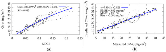Accuracy assessment for different empirical models on the basis of the calibration dataset (N = 2452, 60%) and the validation dataset (N = 1635, 40%) are presented in Table 4. The exponential Chl a models for all indices gave the most inaccurate prediction of Chl a concentration (MAPE = 45–74% and Bias = 0.15–0.77 mg/m3). The power 2B and PH models showed the highest values of Bias (0.27 and –0.13 mg/m3). Among other models, it was difficult to select the best one because of the closeness of their efficiency parameters. The power and polynomial 2B models gave approximately the same estimates (RMSE = 9.76 mg/m3; MAPE = 40.6% and MAPE = 41.6%; Bias = 0.05 mg/m3 and Bias = 0.02 mg/m3). The linear 2B model had slightly lower accuracy (MAPE = 44.16%), but could also be used. The power 3B model [61] had better parameters (RMSE = 9.33 mg/m3; MAPE = 39.0%; Bias = 0.02 mg/m3) than the linear and polynomial 3B models due to more accurate fitting for Chl a > 80 mg/m3. In addition, this model showed the lowest RMSE among all models. The power #2 and the polynomial NDCI models had the same RMSE and MAPE as similar 2B models, however, their Bias is smaller. At the same time, the polynomial NDCI model overestimates forecasts, but the power model underestimates it. RMSE and Bias of the linear NDCI models are slightly higher but its MAPE of 37.1% is the lowest among all investigated models. For PH, the polynomial and the power #2 models gave the best results, but their efficiency parameters are worse than NIR-red edge models. The best models for each index are marked in bold in Table 4.