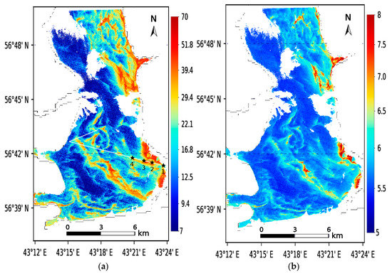 Despite the fact that measurements were performed on closed transects for 2 days (Figure 4), the daily variability of Chl a and TSM concentrations was great. On the second day, the concentration of Chl a and TSM increased by factors of 4 and 1.5, respectively. In some places, the maximum of Chl a concentration reached a value of 463.4 mg/m3. These variations were associated with the changes in the water surface state. According to the meteorological archive [36], the first day of measurement was the last day of prolonged wind forcing of the western direction. In that morning, surface roughness was characterized by waves with an average height of 0.3–0.5 m (in opposition to 0.5–1.0 m in the previous days). In the evening the roughness was completely damped. As a result, in the morning of the second day of measurements, phytoplankton concentrated in the thin near-surface water layer and formed strong heterogeneous structures with different scales, starting from a few meters. These structures were observed during all day long due to calm weather.
