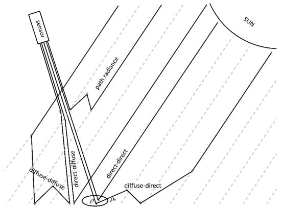 These are i) the path radiance, i.e., the portion of solar radiation scattered by the atmosphere to the sensor without reaching the ground; ii) the direct–direct contribution, i.e., the solar radiation directly reflected by the target to the sensor; iii) the diffuse–direct contribution, that is the incident diffuse light directly reflected by the target to the sensor; iv) the direct–diffuse contribution, that is the direct solar radiance reflected by the background and then scattered by the atmosphere to the sensor; and finally v) the diffuse–diffuse contribution, which is the diffuse incident light reflected by the background and then diffused again by the atmosphere to the sensor. The incident diffuse light also includes multiple scatterings between the soil and the atmosphere. In Figure 1 a simplified scheme of radiative transfer in the atmosphere/soil system is shown with the five different contributions.