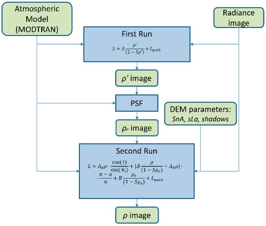 To properly estimate ρ, ρe should be estimated first. As a matter of fact, ρ is required to estimate ρe. For this reason, two correction steps are required. Thus, in the implemented schema, a first correction run is applied taking into consideration the model of Equation (1), which does not include the topographic correction. In this first run, the atmospheric column height is considered constant (DEM not included in the MODTRAN simulation). Applying the PSF, described in the previous chapter, to the reflectance obtained from this first run, ρe is obtained to be used in the second run. The second run applies to the model of Equation (11), which includes the elevation model and the adjacency effects, and gives ρ in the output. In Figure 2 a schematic representation of the algorithm flow is shown.