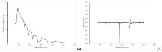 At sensor radiance simulated by MODTRAN corresponding to an albedo of 0.4 (a) and related atmospherically corrected spectrum (b).